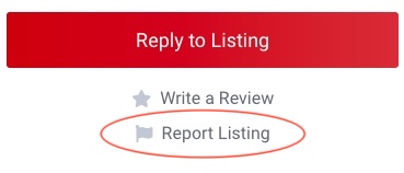 If you see a listing that fails to abide by our Terms and Conditions, or if you experience unsafe communications with a member, use our report feature! It is completely anonymous and notifies our team to investigate the issue. To submit a report simply click the “Report Listing” button located alongside each listing as shown below. If you have further concerns or questions please Contact Us at your convenience.